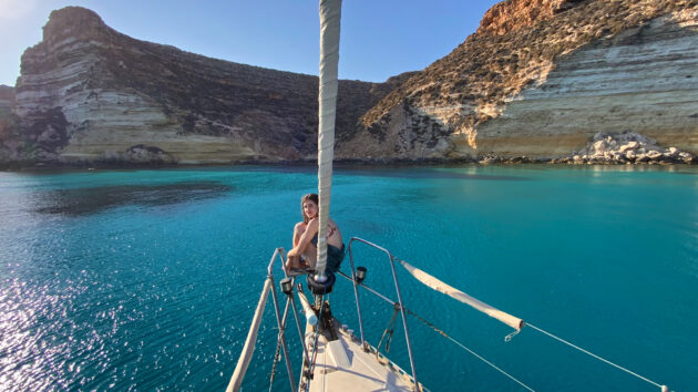 We were anchored over deep water and a notoriously rocky seabed on the East end of Lampedusa. With the wind quickly rising and nightfall approaching, every boat was making for their home berth. We pulled up the transom ladder and got set to follow.
