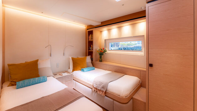 Identical aft guest cabins with twin beds (can be doubles, triples, Pullmans etc too). Photo: Oriol Esteve/Photonautic