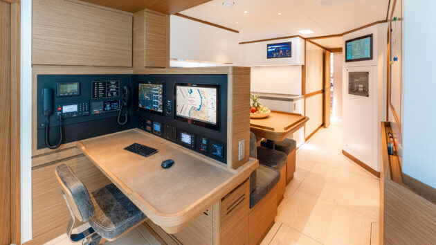 The crew area aft is an ideal layout for up to six crew in three cabins. It includes a large, light galley adjoining a mess, an ensuite captain’s cabin and large navstation at the foot of the direct access companionway.