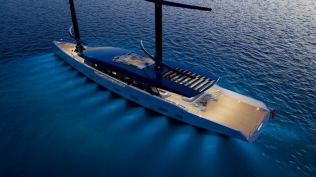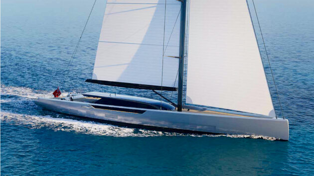 Dixon Yacht Design’s latest radical sailing concept is a twin-masted Dynarig yacht capable of operating without burning fossil fuels. The 60m design has a long, low-slung coachroof with inverted windows that give it the looks of a go-anywhere explorer yacht.