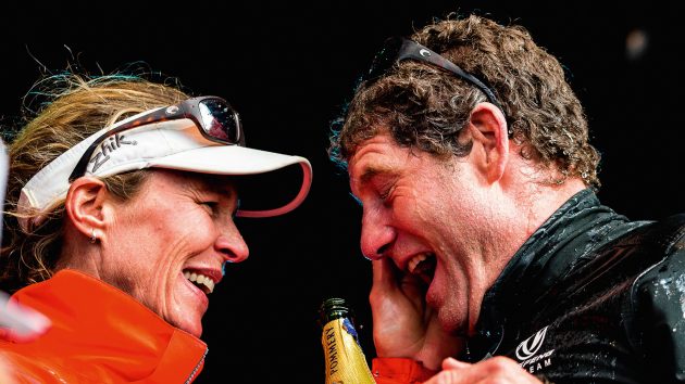 Celebrating Dongfeng’s Volvo Ocean Race win with crew mate Carolijn Brouwer. Photo: Eloi Stichelbaut/Dongfeng Race Team