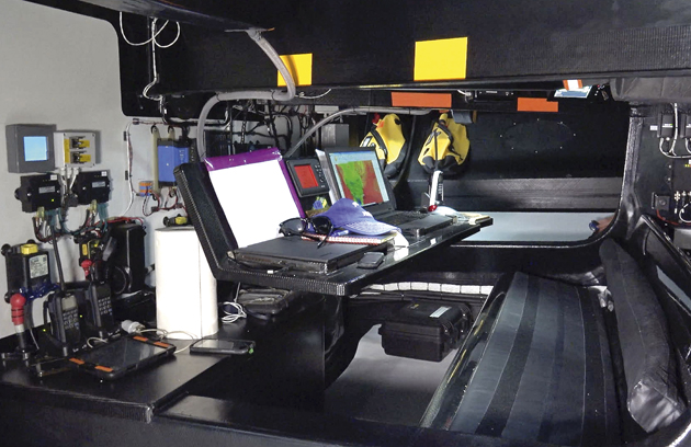 NAVIGATION STATION is located immediately behind the companionway bulkhead, also being the point from which all the boat’s electrics are controlled. The carbon fibre chart table can be tacked and the bench seat is long enough to allow the navigator to sleep or rest here if required