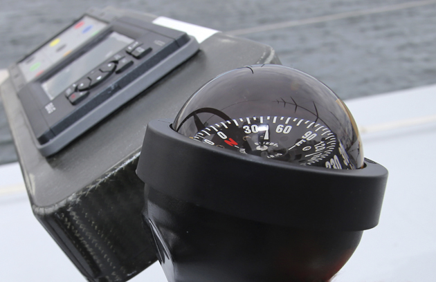 COMPASS The cheapest fitting on the boat is a card compass that would look more at home on a Laser. Though the helmsmen and trimmers use the digital read-outs, the rules require a card compass to be fitted, so the team went looking for the simplest and lightest