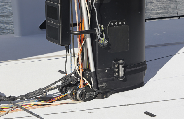 MAST As with the IMOCA 60s, the mast is positioned well back in the boat; sited directly above the canting keel, the mast is deck-stepped on a triangulated mast post integrated into the same frame as the keelbox. Static loads on the mast base are in the order of 75 tonnes, increasing to 150 tonnes under sail