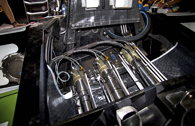 DEFLECTOR RAMS The three deflectors controlling mast bend are trimmed by three hydraulic rams that work interactively. Although cheat sheets have been developed for basic settings, the crew is still exploring setting refinements for these