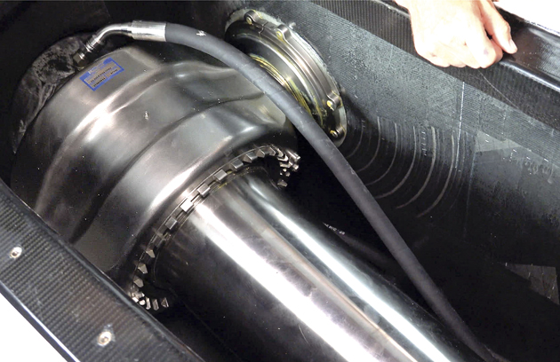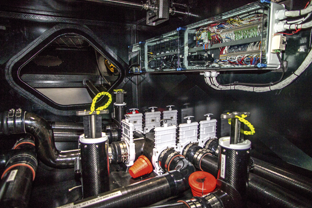 WATER BALLAST Manifolds, pipes and valves controlling water ballast are located behind the navstation bulkhead. Water ballast comprises 6.5 tonnes per side in three tanks on each flank. All pipework is built in carbon fibre