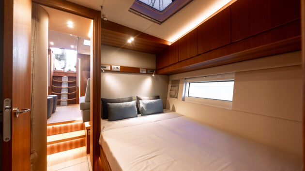 Large owner’s cabin aft with its increased light and views through larger hull portlights. Photo: Andreas Lindlahr/EYOTY