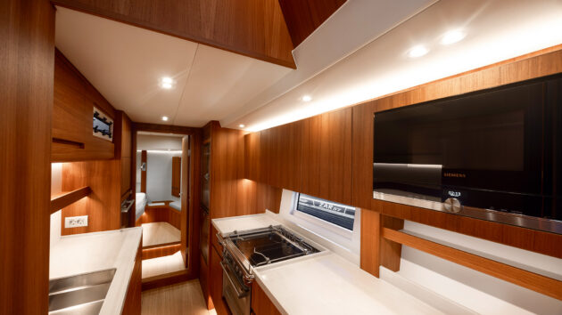 Well appointed galley is in the passageway between saloon and owner’s cabin. Photo: Andreas Lindlahr/EYOTY