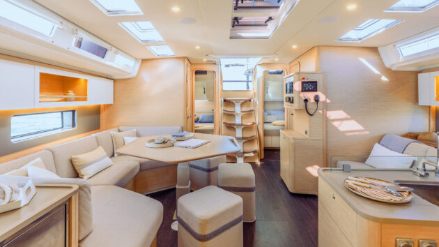 Two fundamentally different saloon and galley layouts are offered for the 48, and there’s an option of three, four or five cabins, along with two, three or four heads.