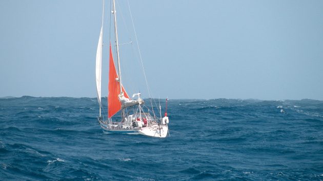 Heaving-to is the art of stalling a boat at about 60º off the wind by backing the headsail, sheeting the main in tight and locking the helm ‘down.’ Just like balancing a boat under sail, heaving-to, especially on more modern hull shapes, requires a careful balance of headsail size, mainsail trim and rudder trim. Once dialled in, the boat takes care of herself, allowing the crew time to recharge. It’s a useful tactic on any long passage, even in nice weather; stop for a swim, wait for a favourable wind shift, ride out a dark night before entering a new port.