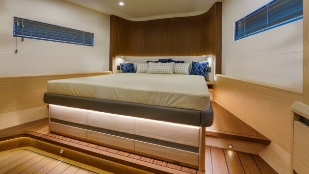 To make space for this, the ensuite for the owner’s cabin is tucked over to starboard on entry and the berth, albeit huge and highly inviting, is right forward.