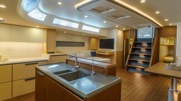 Walkaround island galley is a central feature. Photo: Luca D’Ambrosio/The International Yachting Media