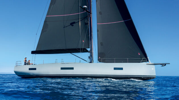 The RS line has all-carbon decks, which helps keep the 66’s displacement down to 26-tonnes, while hulls are infused glass-carbon sandwich, a hybrid blend to help offer some noise and vibration absorption. A glance up at the lofty rig will tell you this is a generously canvassed yacht, which should make the most of this type of fair weather, light wind sailing, while the stats from the performance ratios confirm this serious sail area allies with a lightweight, powerful hull.