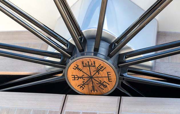 The spectacular bright red kite went fizzing up and ballooned into life, filling out a symbol depicting an ancient Nordic compass rose.