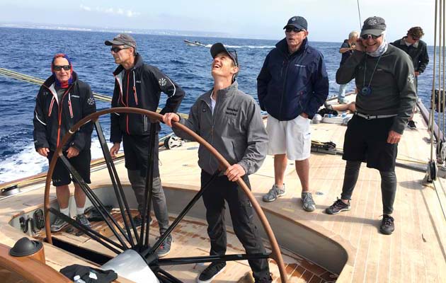 Think of classic J Class pictures from the 1930s and you picture a helmsman in a blazer and tie standing high on the aft deck battling a traditional wooden wheel. One of Svea’s striking features is her extra large wheel, nearly half of which vanishes into a well below decks.