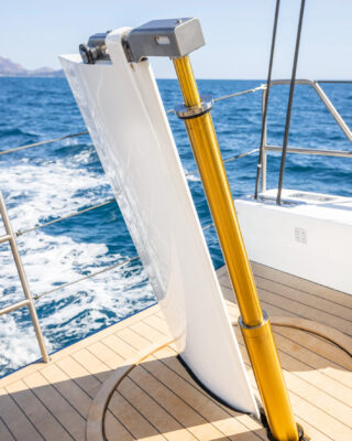 But when it comes to their innovative twin rudder system they’re more open. Verdier was initially keen to have kick-up rudders to allow the windward one to be lifted to reduce drag, especially upwind, but this was not considered practical aboard a boat that will spend plenty of time moored stern-to. Instead, Magic Carpet-e has daggerboard-style rudders mounted in rotating barrels. When they lift they come through the cockpit sole.