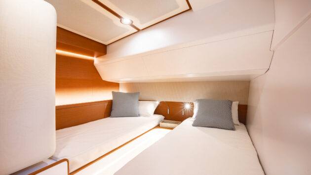 That’s a bold call aboard a boat with a deck-stepped mast that relies on its fore and aft support from the runners. But among the long list of advanced technology aboard this boat there is one area that is easier to admire, her looks below decks.