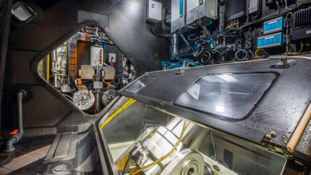The engineering is not just fascinating in a system that can reduce its draught in just two minutes, but is a thing of beauty down below. So much so that the primary keel support structure, which has been milled out of two giant billets of titanium, has been not so much enclosed, but displayed in a wet box that looks more like a museum showcase complete with lights.