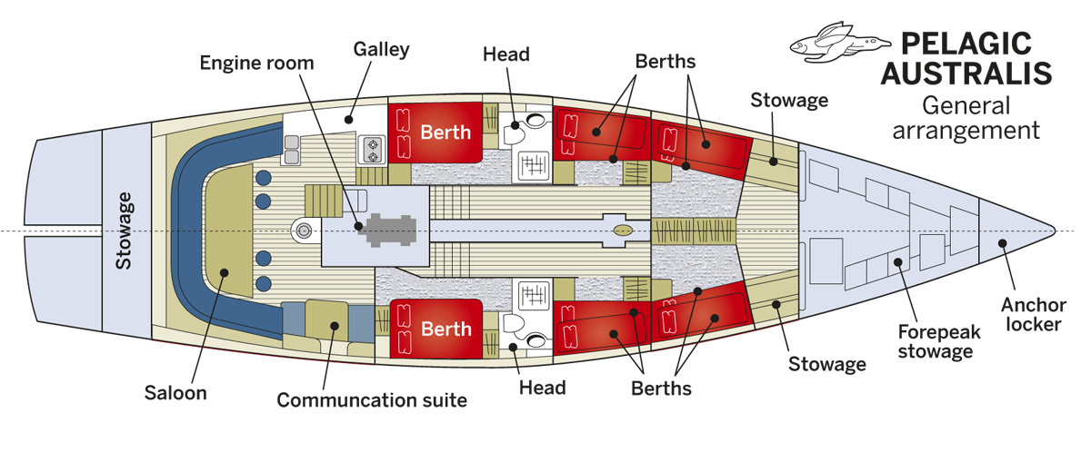 State-of-the-art satellite communications were a must, especially for media projects. Just as important is a powerful propulsion system: a 250hp Cummins with a four-bladed fixed prop that we freewheel under sail. Getting from A to B efficiently is what the game is all about down south, not least to be able to dodge the weather. We seldom sail below six knots, so have sacrificed a substantial amount of light-air performance with a shorter rig and minimally cut sails.