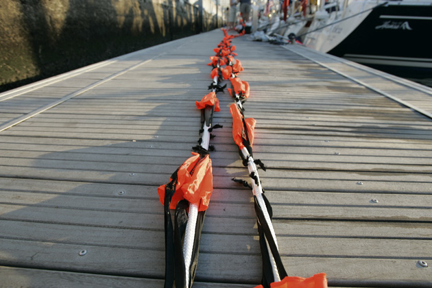 It comprises a series of small drogues connected into a long series and deployed astern. The number of these will depend on the displacement of the yacht – typically, as many as 90 or 100 cones may be needed in series – and ideally the drogue needs to be made up and coiled ready to deploy from points at the stern that are strong enough for the very considerable loads. Additional chainplates may be needed.