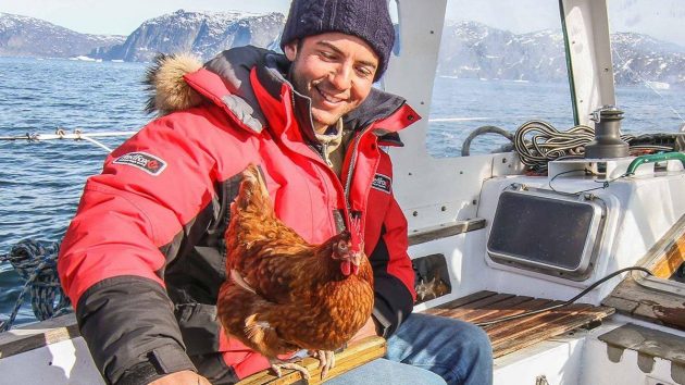 Adventurous young sailor Guirec Soudée and his adopted hen Monique sailing on Yvinec. Photo: Guirec Soudée