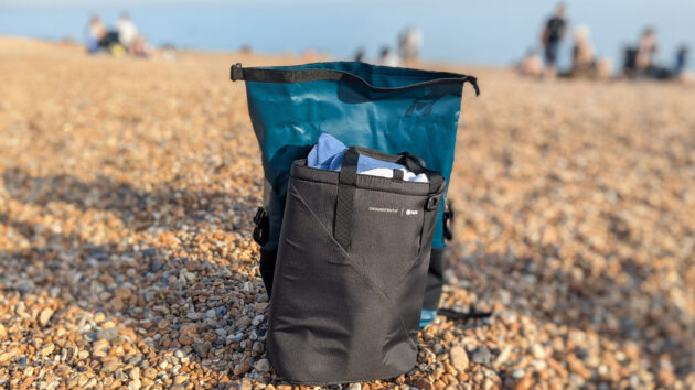 The GroundTruth has a neat little trick, an internal padded tote bag that can be removed and used separately. Although the tote is handy to pull out and use at the beach I think the benefits are slightly broader. Many roll top type backpacks suffer a certain floppyness when they are not full, but with the tote insert added the GroundTruth backpack feels really sturdy.