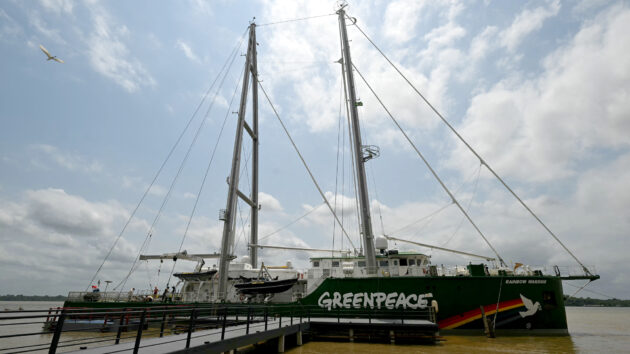 The Greenpeace ‘Rainbow Warrior’ ship docks at the riverbank of the Federal University of Para (Orla da UFPA), Belem, Brazil for COP30 UN Climate Summit. Photo: Mauro PIMENTEL / AFP.