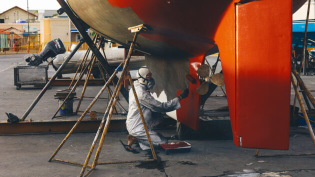 It took four 12-hour days of grinding, sanding, glassing, and fairing Agápe’s keel before she was ready to paint.
