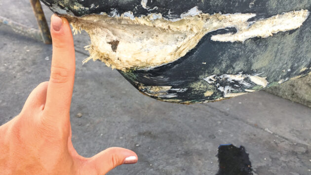 Hitting rocks took a chunk out of Agápe’s keel… Photo: Joshua Shankle