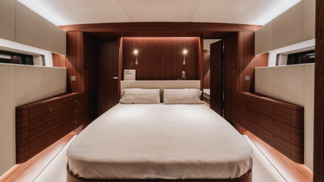 The significant interior volume, which is 20% greater than its predecessor, helped the design team to offer a large variety of layouts, including owner’s accommodation fore or aft. Jaudenes admits this was a challenge: “to conceive an aesthetically pleasing vessel capable of accommodating four distinct layouts while maintaining essential structural elements.”