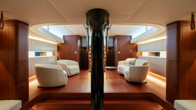 The style takes influence from the luxury furniture industry – the free-standing furniture is particularly bold in the saloon, and stands out for its minimalism. Aboard Calabash, the semi-raised saloon simply features just these two chairs and a small sofa, deliberately done to emphasise the space (so YYacht’s novel sliding handrail system is needed at heel!). The mast base has pride of place, like a totem pole in the centre of the saloon.